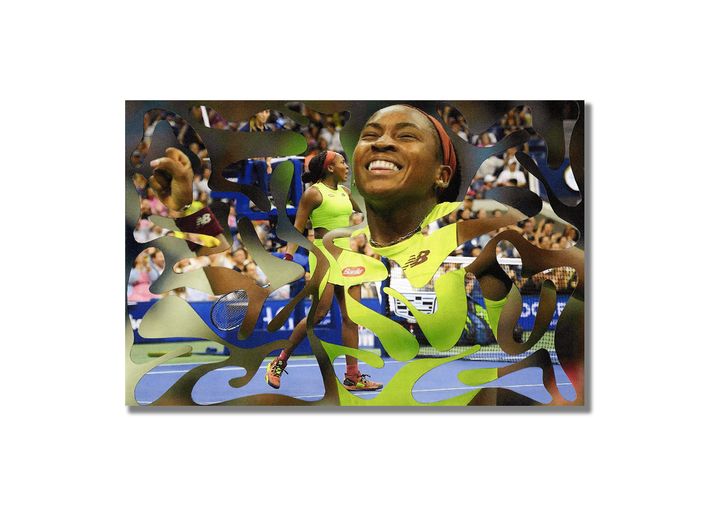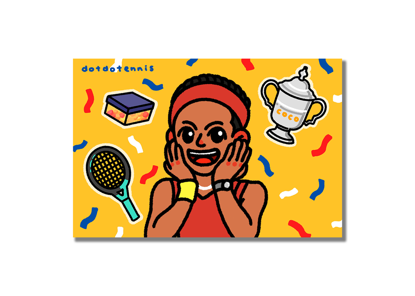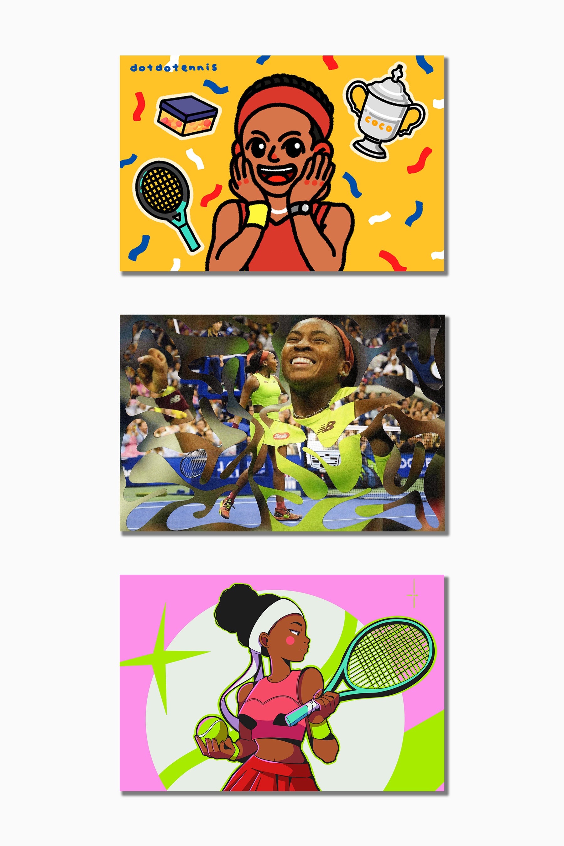 To celebrate the launch of the "Coco Gauff: 2023 US Open" issue, we commissioned three artists to create artwork of Coco Gauff at the 2023 US Open. Printed as postcards, one of these beautiful pieces comes free with each order. To get all three postcards, you can purchase this pack, which covers the cost of shipping and handling.